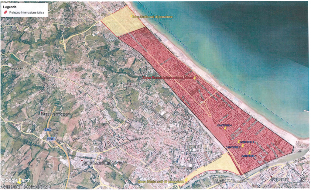 Linterruzione della fornitura di acqua interesserà il quadrilatero compreso tra il fiume Pescara, la riviera Nord, confine di Montesilvano, Via dell’Emigrante, Via Caravaggio e Via Ferrari, ed avrà luogo dalle ore 9:00 elle ore 21:00.